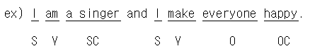 → 해석:나는 가수이고 그리고 나는 모든 사람을 행복하게 한다.