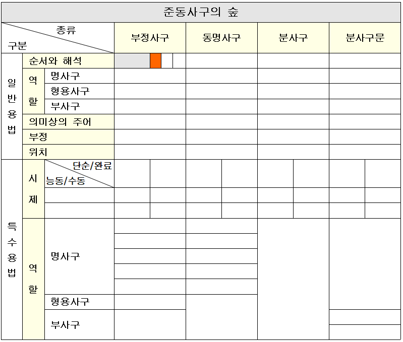 준동사구의 숲은 아래표와 같은데, 오늘 강의할 부분에 주황색 음영을 넣었고 이미 강의한 부분에는 회색 음영을 넣었습니다. 숲을 먼저 본 후 나무를 봅시다.