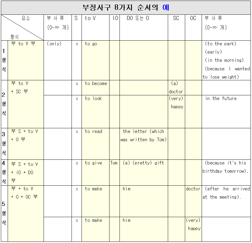 | < 참고 링크 > 부정사구 1강: 부정사구 8가지 순서와 해석(1~5형식) https://eskill.tistory.com/165 |
