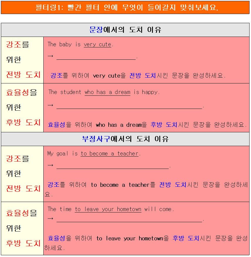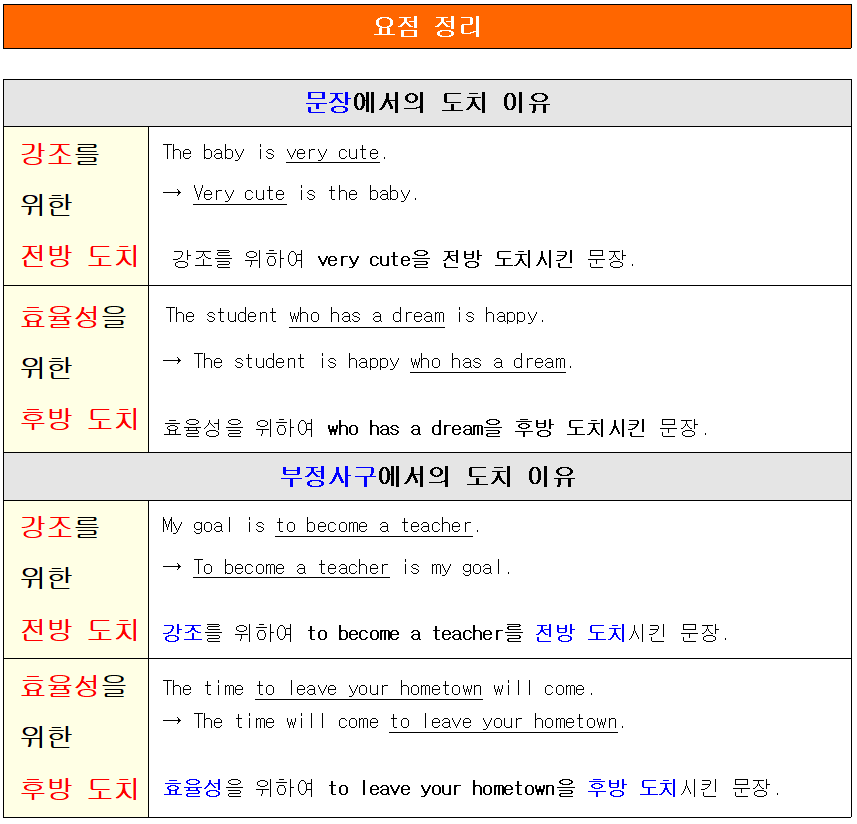 ① 강조 또는 ② 효율성을 위하여 도치 가능하다는 것을 강의하였고