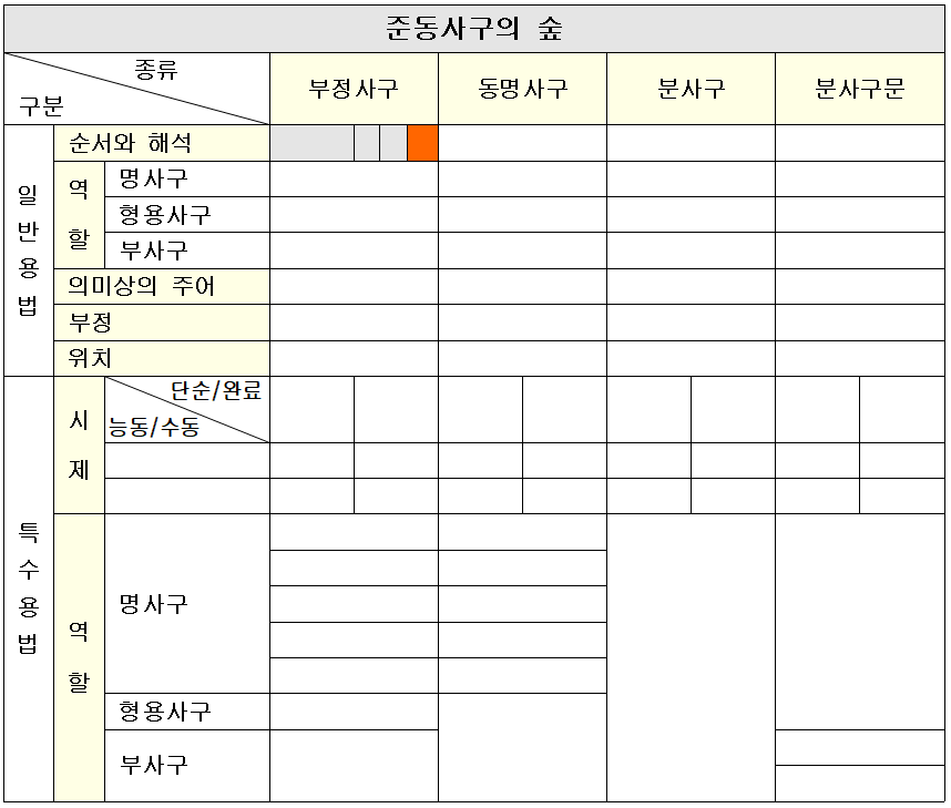 준동사구의 숲은 아래표와 같은데, 오늘 강의할 부분에 주황색 음영을 넣었고 이미 강의한 부분에는 회색 음영을 넣었습니다. 숲을 먼저 본 후 나무를 봅시다.