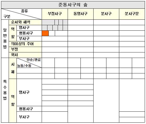 준동사구의 숲은 아래표와 같은데, 오늘 강의할 부분에 주황색 음영을 넣었고 이미 강의한 부분에는 회색 음영을 넣었습니다. 숲을 먼저 본 후 나무를 봅시다.