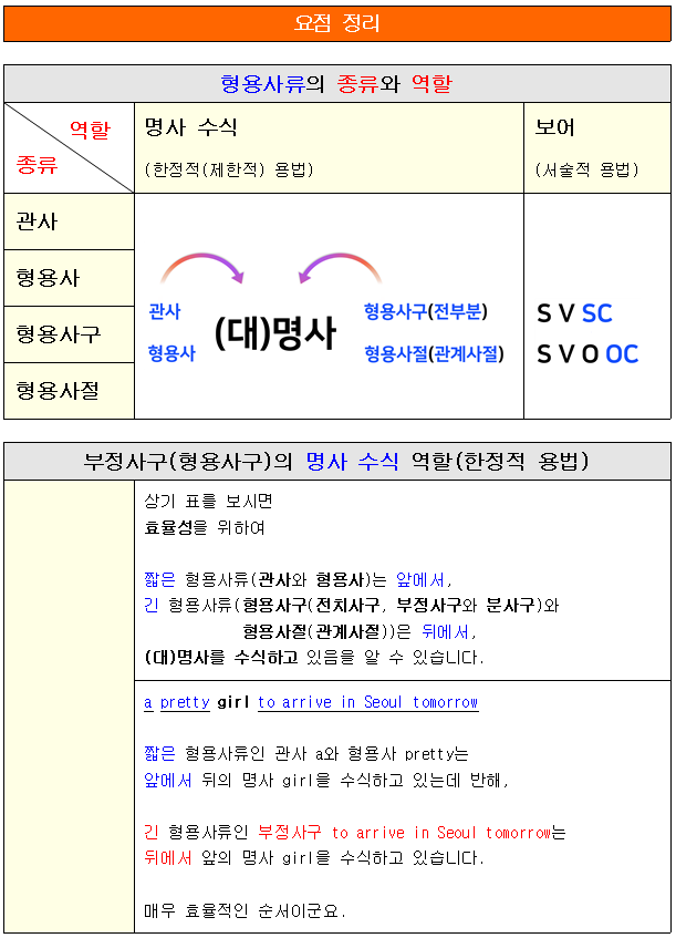 형용사류의 종류와 역할을 아래에 표로 정리해보았습니다.