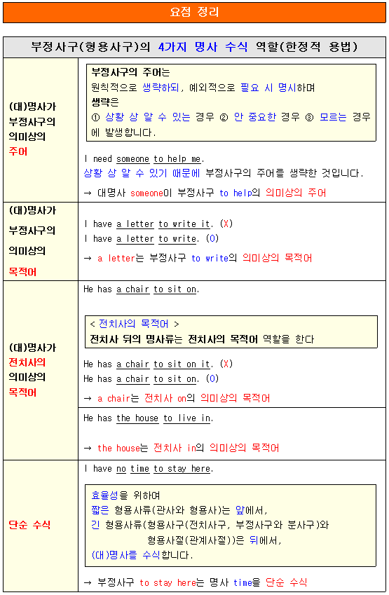오늘은 부정사구 8강: 일반용법 – 역할 – 형용사구2(4가지 명사 수식)를 강의하겠습니다.
